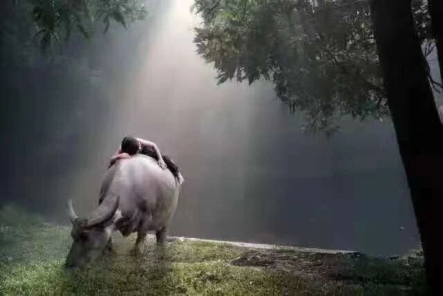 后来的日子里,我一直把大壮(我那时给它起的名字)当成最好的朋友和伙伴。暑假的每天清晨,太阳刚刚露出半边脸,我已经骑着大壮出去放牧了。那时的我也就十来岁,爬上大壮的背可不是一件轻松的事情,但是作为大壮的好朋友,当然不需要自己那么费力,只需拍拍大壮的脑袋,大壮立刻会意的低下头,我两手抓着大壮的犄角,蹲在它的头上,它把头一昂,我就顺利的骑到了它的背上,感觉帅气极了。作为对好朋友负责任的我,肯定要找青草最鲜嫩、最丰茂的地方去。田野里的空气弥漫着庄稼和野花野草混合后特有的味道,清澈的小河如同丝带一般蜿蜒镶嵌在满眼的绿色之中,青草叶儿上的露珠被初升的太阳照得晶莹剔透,阵阵的清风不时温柔的抚过我的脸颊,我悠闲的坐在牛背上,听着大壮哧啦哧啦香甜的吃草声,心情愉悦中望乎所归。不知不觉中日上三竿,看到牛背后面凹下去的“窝”完全鼓起来,我知道大壮已经吃饱,我也该回家安慰一下饥肠辘辘的肚子了。