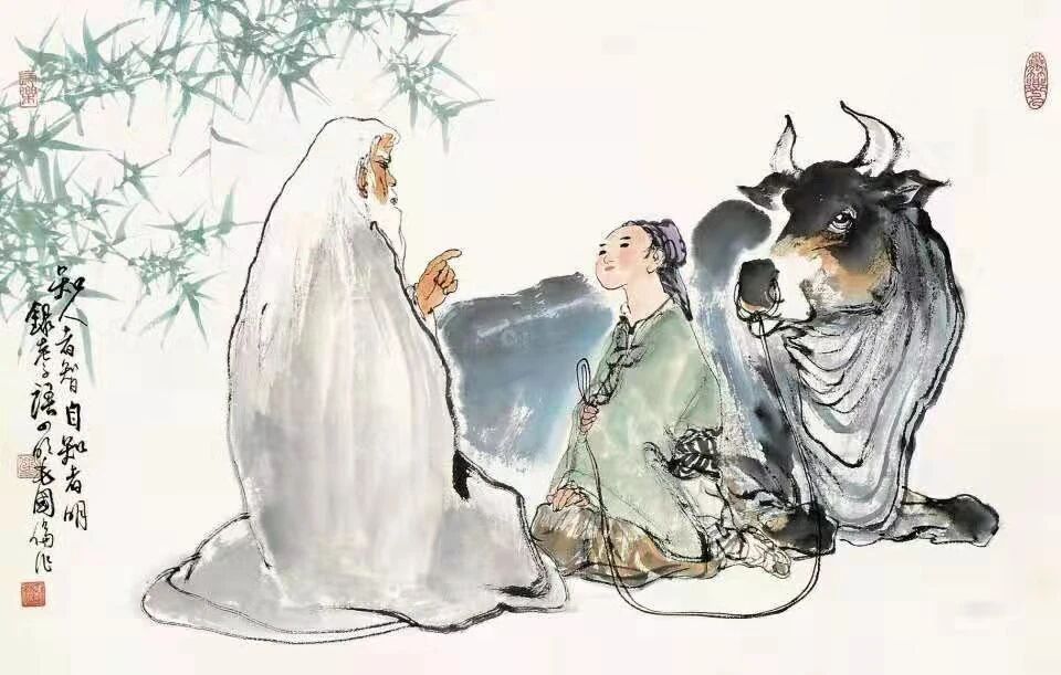 牛与道家文化的紧密联系,又为牛增添了一份神秘色彩,蒙上一层神性光辉。老子证得无极大道,站在宇宙的长河之中,超越时间空间,他要去完成他的神圣使命。而驻守函谷关的关令尹喜,似有感应,静立于关楼,翘首遥望,观天象紫气自东滚滚而来,老子骑青牛西行,也许是偶然,也许是圣人本意就要为世间留下不朽的经典,总之,青牛载老子而来,尹喜与圣人零距离的交集,令全世界叹服的伟大经典《道德经》横空出世了。老子作为太上的化身,有无数的选择,为何只要青牛为坐骑?拥有无上智慧的老子,当然不是随便选择,一定有着深刻的道理。牛性情温和,忠诚善良,任劳任怨,默默奉献,不求回报,忍辱负重,毅力坚韧而又处下不争,甘做人梯而又甘在人后,这些不正是《道德经》思想的最好体现吗?牛的精神和品质与道相合,牛的一生就是行道和证道的一生。